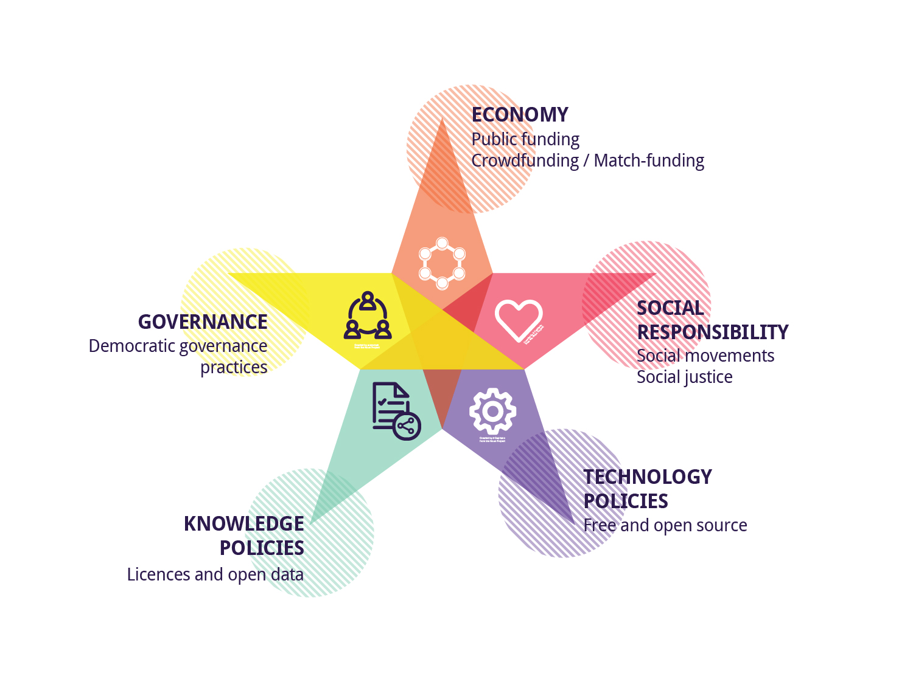 - Technological policy: Regarding the mode of property and freedom associated with type of software used and its license (free or proprietary) and the model of technology architecture: distributed (using blockchain, for example) or centralized (software as a service). Key aspects of data and software sovereignty, as addressed by the technical developments of the DECODE project, are also fundamental for this dimension, as well a data commons related to the different economic models.