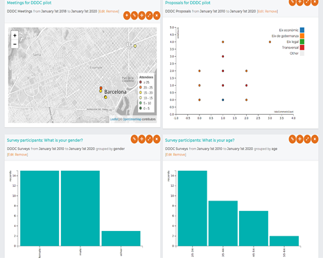 2. Proposals (2018/11/14 - 2018/12/21): during the second phase of the process, proposals were collected to address issues mapped during the diagnosis phase, including proposals derived from the previous work in DECODE. Likewise, a session of analysis of the survey sociodemographic data was carried out, and later linked to the design of communicative actions to improve inclusion in the process. The Barcelona Now (BCNNOW) dashboard developed by the Eurecat team was used for the analysis.