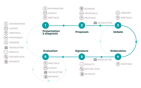 The DDDC participatory pilot had a total duration of six months and was developed in several phases, which ran between October 18th 2018 and April 15th 2019. Throughout the process, 8 face-to-face meetings were held across the city, connected with the activity developed in the dddc.decodeproject.eu platform, based on Decidim software.